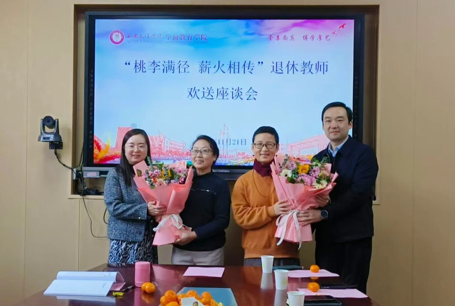 最后,学院班子代表为两位老师送上精心准备的纪念品,这份礼物不仅是对她们教育生涯的深切赞美,更是学院与退休教师之间深厚情谊的生动象征。