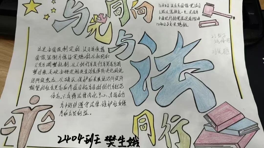 依托专业美术素养,我院发起“绘法筑梦”手抄报创作活动。同学们以“宪法+幼儿教育”为主线,将抽象法条转化为童趣作品:有的绘制“宪法保护幼儿成长”连环画,有的用卡通形象诠释“平等、公正”价值观,还有的设计“幼儿法治启蒙绘本节选”,让手抄报成为可直接用于教学的微型教材。优秀作品在校园展示,既展现了专业技能,更让宪法精神以直观形式浸润校园。