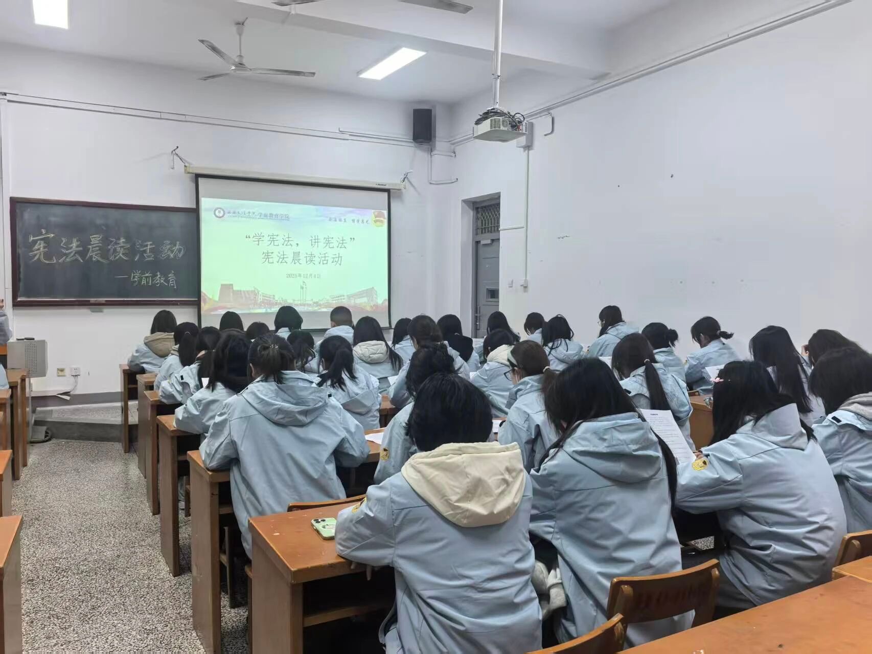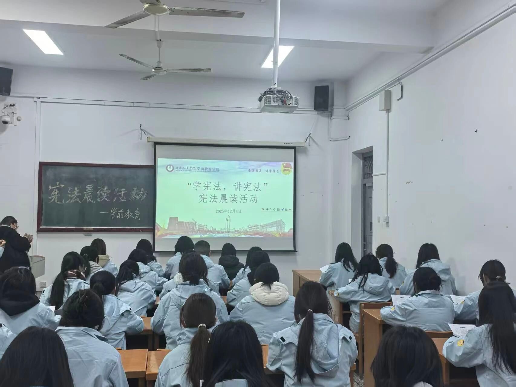 晨光中,全体2025级新生齐聚班级,开展“晨读悟宪”活动。同学们手持宪法节选读本,齐声诵读公民基本权利与义务、国家机构等核心条文,朗朗书声传递着对宪法的尊崇。诵读后,学生代表结合专业发言:“作为未来的幼师,我们不仅要自身懂法守法,更要把宪法精神转化为幼儿能理解的语言,在日常教学中播撒法治种子。”沉浸式体验让宪法条文从文字转化为内心认同,更明晰了法治启蒙教育的职业使命。
