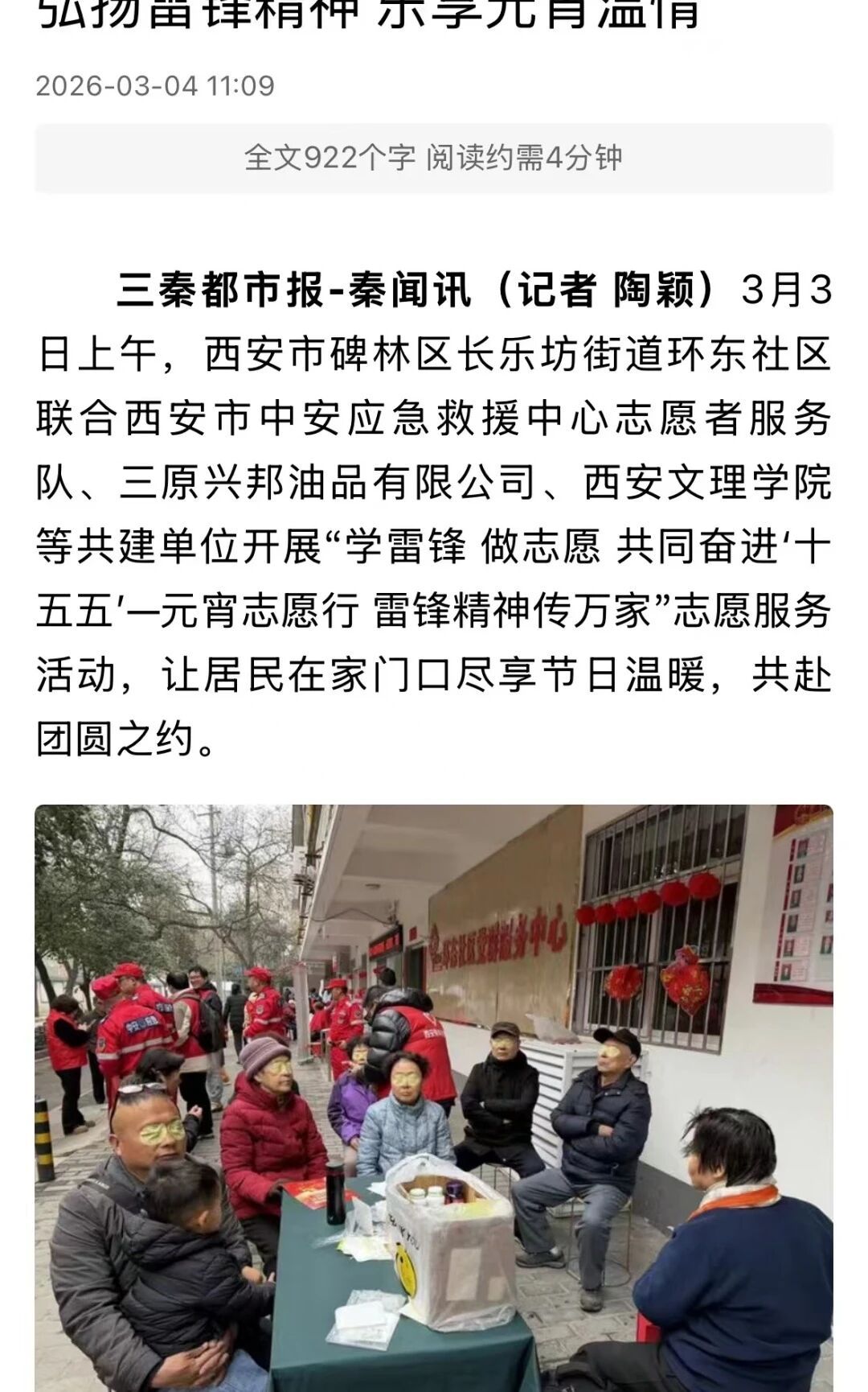 为深入学习贯彻习近平新时代中国特色社会主义思想,大力弘扬“奉献、友爱、互助、进步”的志愿精神,在第63个“学雷锋纪念日”来临之际,西安文理学院学前教育学院组织分团委志愿者与“乐劳”学生党员先锋示范团队,于3月3日走进碑林区长乐坊街道环东社区,开展了形式多样、内容丰富的学雷锋志愿服务活动。《三秦都市报》以“传承雷锋精神 志愿服务暖社区”为题进行了报道,《华商报》也对本次活动予以关注刊发。