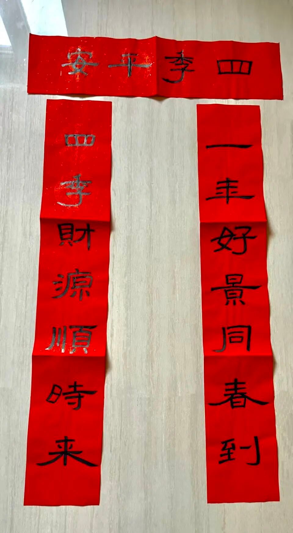此作聚焦丙午马年新春,以隶书书就迎春对联。大红洒金纸衬满年味,笔墨取汉隶规整清雅之姿,笔画纤细劲挺、结体疏朗,适配学前教育场景的童真氛围。联文与横批“四季平安”相呼应,寄寓马年景顺财丰、阖家安康。将传统书法与新春祈福相融,让喜庆红纸承载真挚年味。