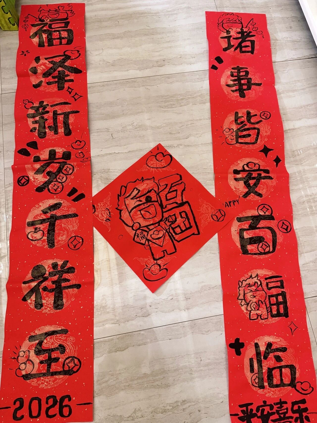 作品以2026年春节为主题,呈现一组红韵盎然的传统春联与创意福字。两侧竖联书“福泽新岁千祥至”“诸事皆安百福临”,底标年份点明时序;中央菱形福字巧融卡通形象——或萌趣人物、或持福卷轴的灵马,辅以祥云、元宝、爱心等吉庆纹饰,缀以星星、圆圈灵动细节。传统书法与童趣设计相映,既承新春祈愿之脉,又以鲜活笔触传递“百福临门”的美好期许,满溢团圆喜庆的年节温情。