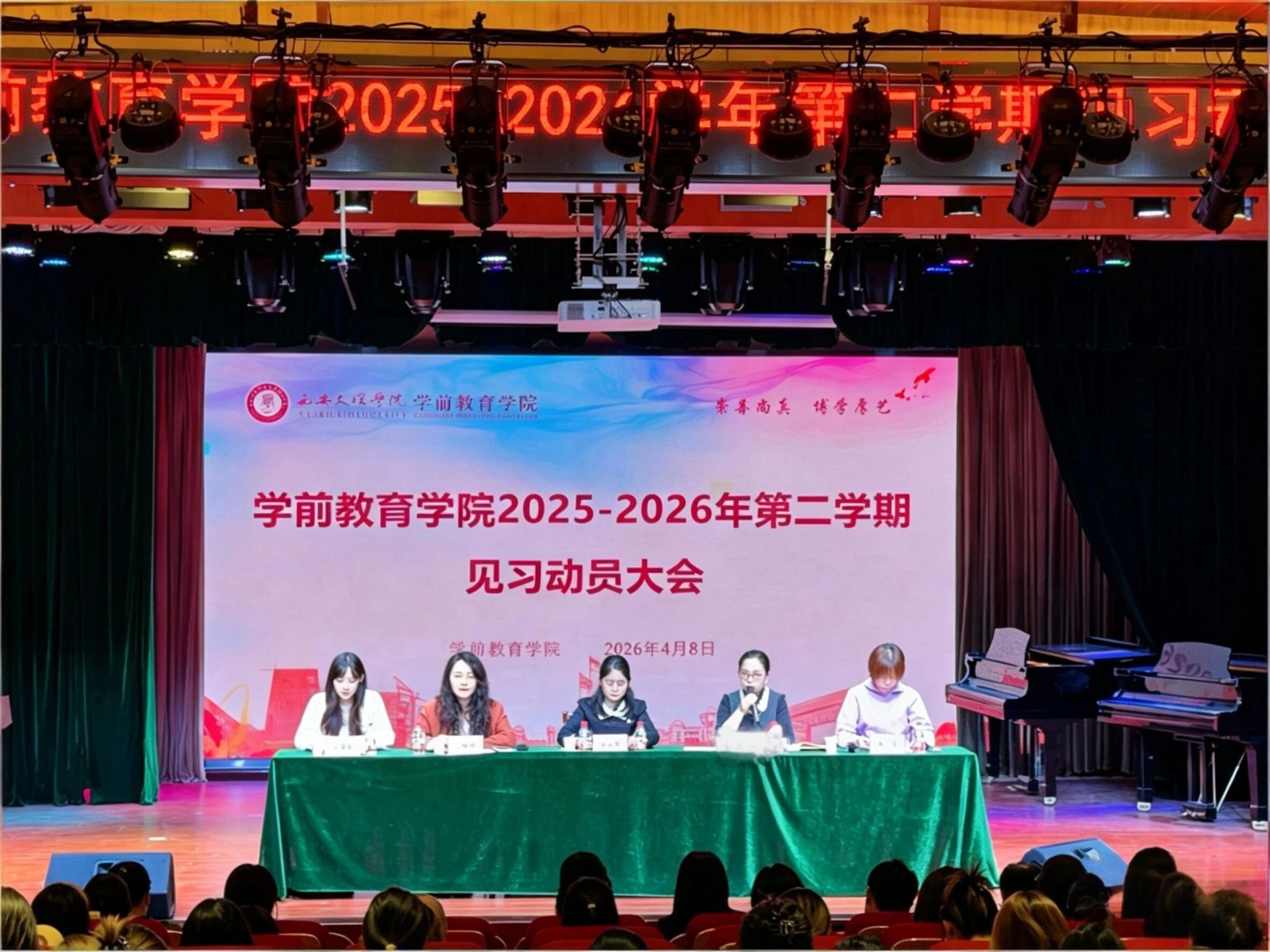 为确保本学期见习工作有序开展,帮助学生明确见习任务,做好实践准备,4月8日下午,学前教育学院在明德楼音乐厅召开2025-2026学年第二学期见习动员大会。西安市第七幼儿园、西安市第二十五幼儿园园长吴丽英应邀作专题讲座。学前教育学院教学副院长雷巧娟、党总支副书记向维娜、学前课程教学部主任郑洁、教学秘书任瑞娟、32名见习指导教师及542名见习生参加会议。会议由郑洁主持。