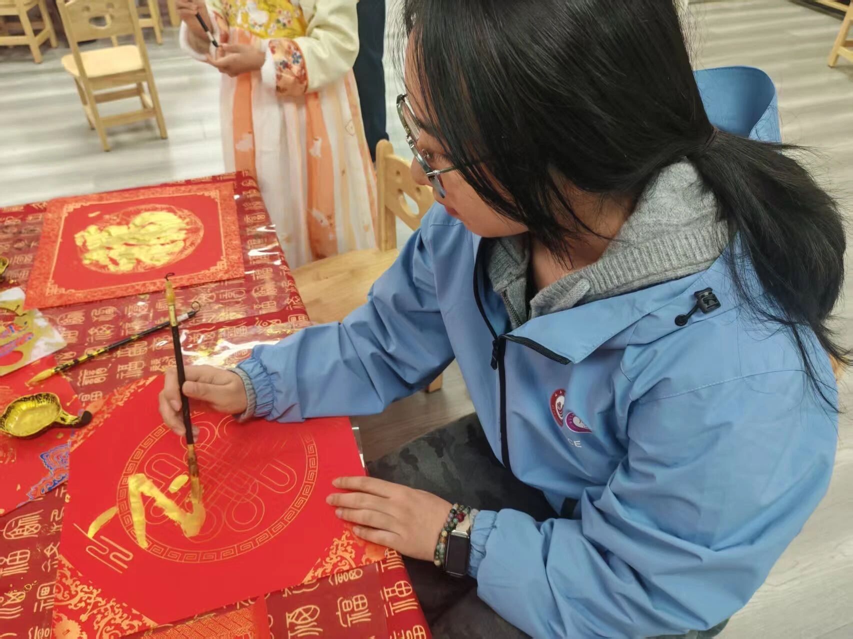 此外,队员们还发挥专业特长,参与到非遗糖画、手写福字、制作糖葫芦等特色活动中。蘸糖勾勒灵动糖画,挥毫书写喜庆福字,熬煮糖浆串起酸甜糖葫芦……传统年俗体验在队员们的协助下变得生动有趣,孩子们在动手与体验中感受着中华传统文化的魅力,也在与队员们的互动中体会着新年的喜悦。