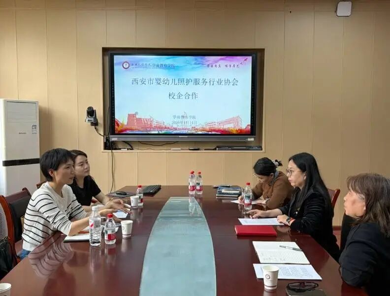 2026年4月14日下午,西安文理学院学前教育学院与西安市婴幼儿照护服务行业协会校企合作座谈会顺利举行。西安市婴幼儿照护服务行业协会秘书长兼西安市托育综合服务中心负责人周建红、协会代表董聪,副院长雷巧娟携婴幼儿发展与健康管理微专业教师张雨、乔娜共同出席。