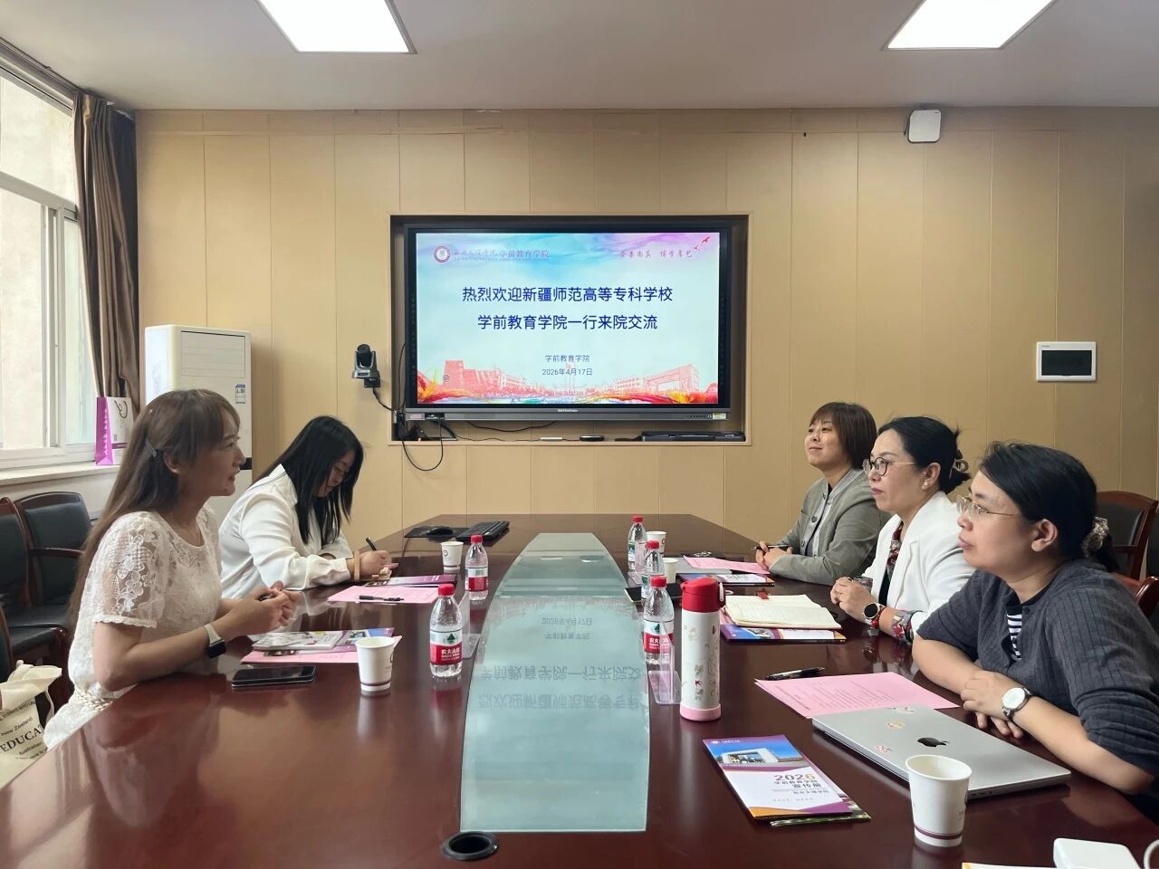 2026年4月17日下午,新疆师范高等专科学校学前教育学院培训教研室副主任桑楠、校企合作负责人姜晓宁一行来我院座谈交流。学前教育学院副院长雷巧娟、学前理论教学部主任乔娜、学前课程教学部主任郑洁参加会议,会议由雷巧娟主持。