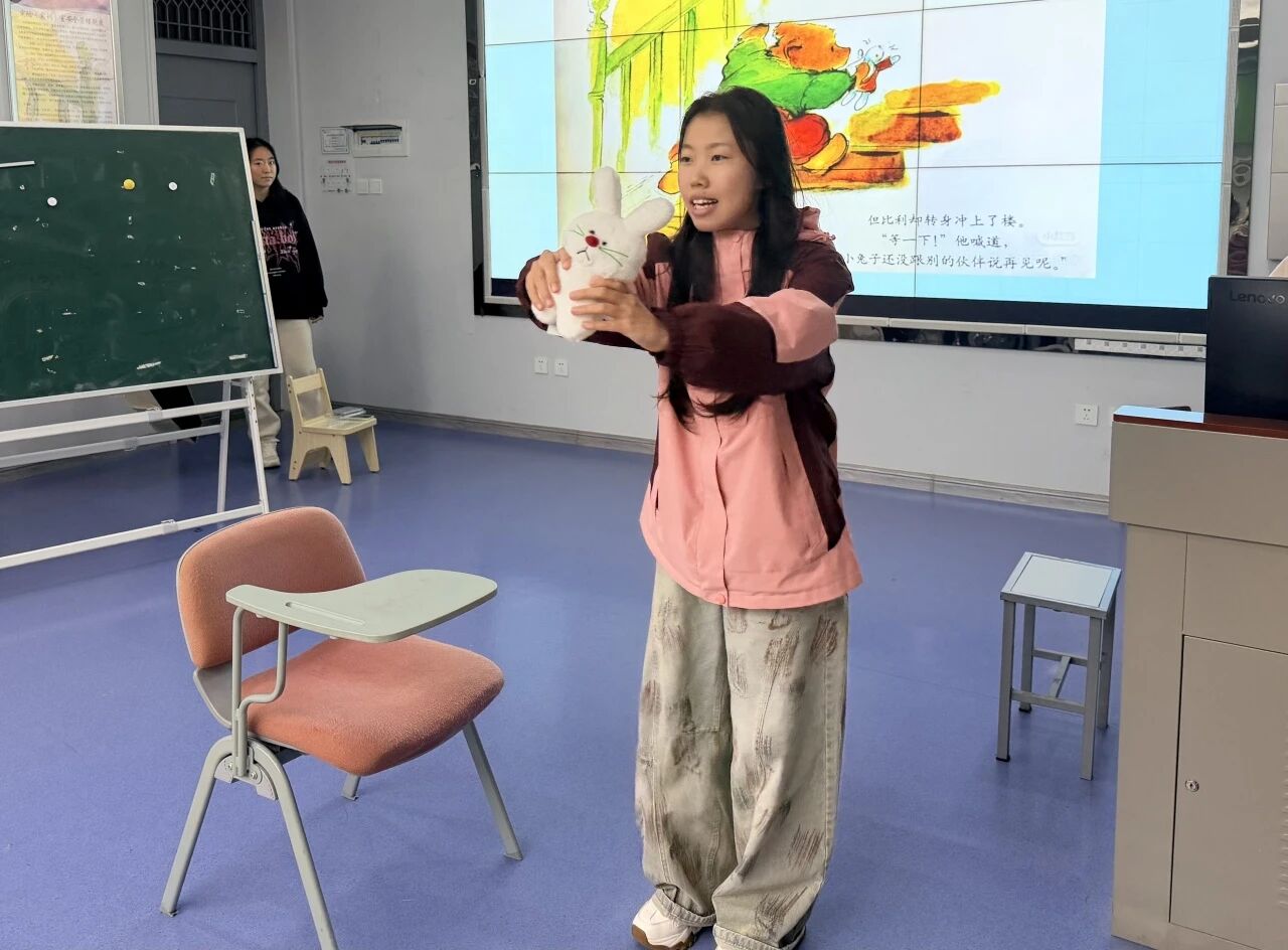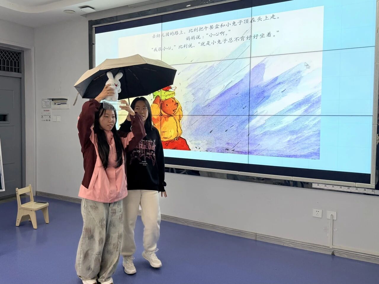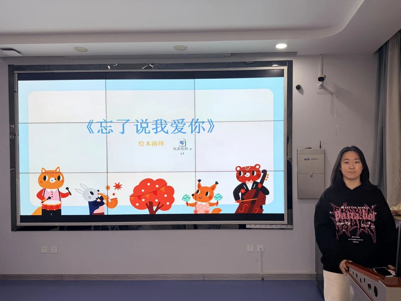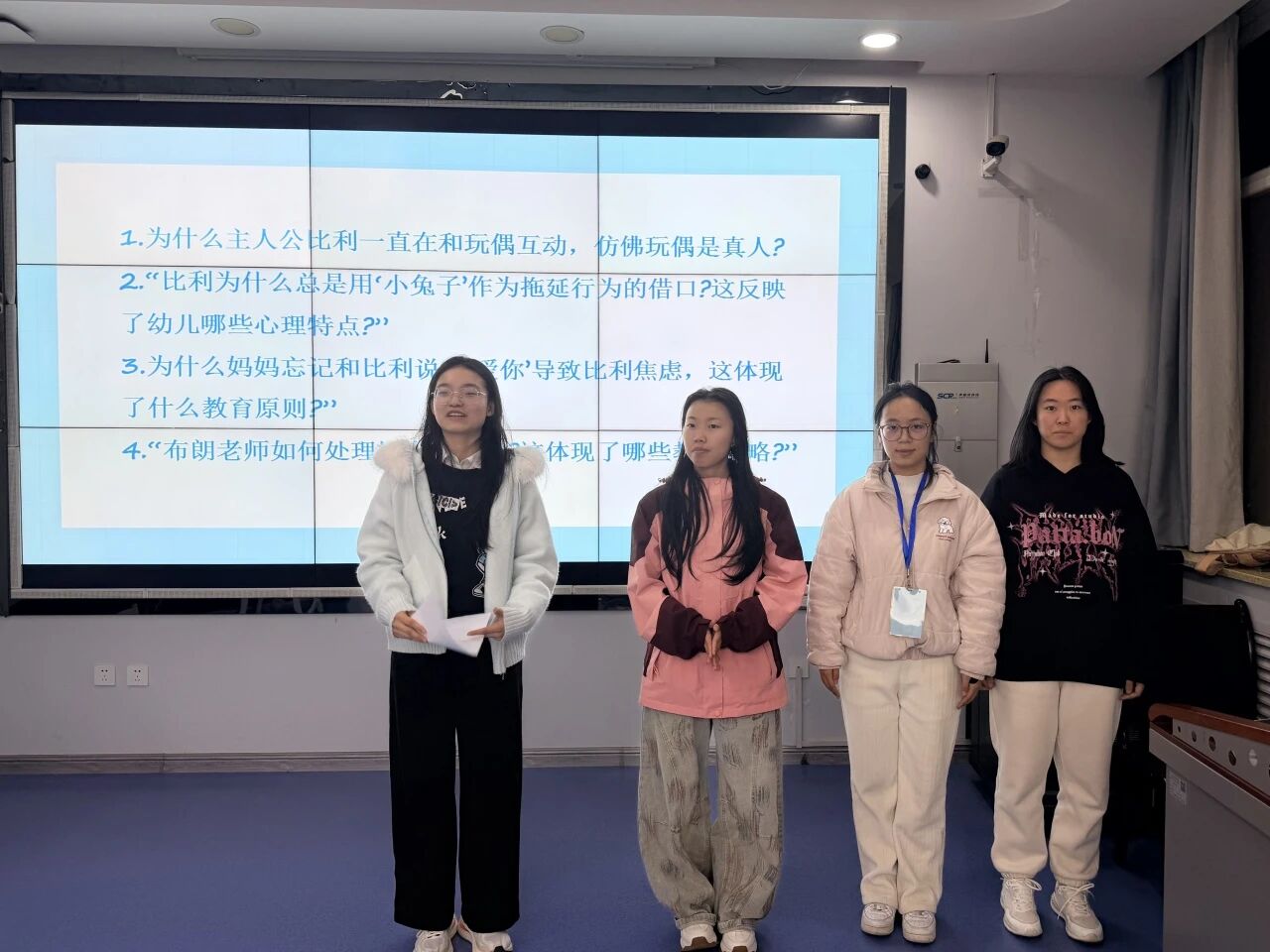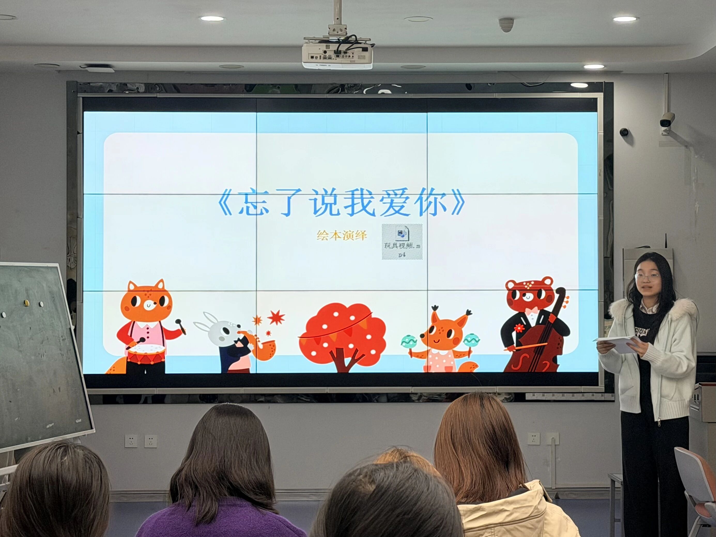 随后,加洁幸、王书悦、李宇星、袁心如四位主讲人联袂登场,以经典绘本《忘了说我爱你》为蓝本,带来了一场沉浸式的情景演绎。她们用生动的角色扮演、绘声绘色的讲述,让同学们仿佛置身故事现场,跟着比利的小情绪起伏,一起分析他拖延行为背后的幼儿心理小秘密。互动环节中,主讲人讲解了一系列由绘本引出的问题,在思维碰撞中逐步拆解了幼儿拖延行为背后的心理需求。
