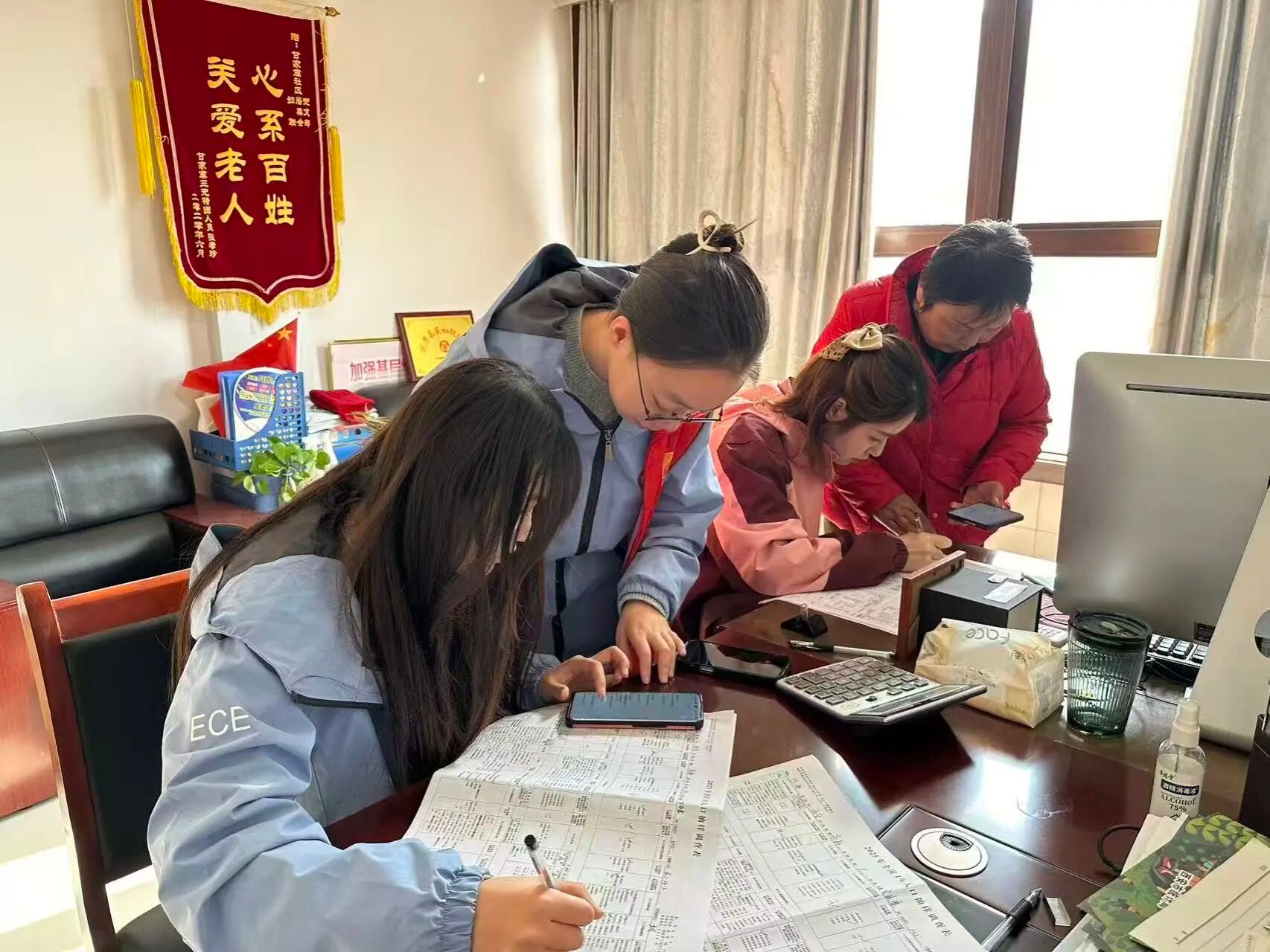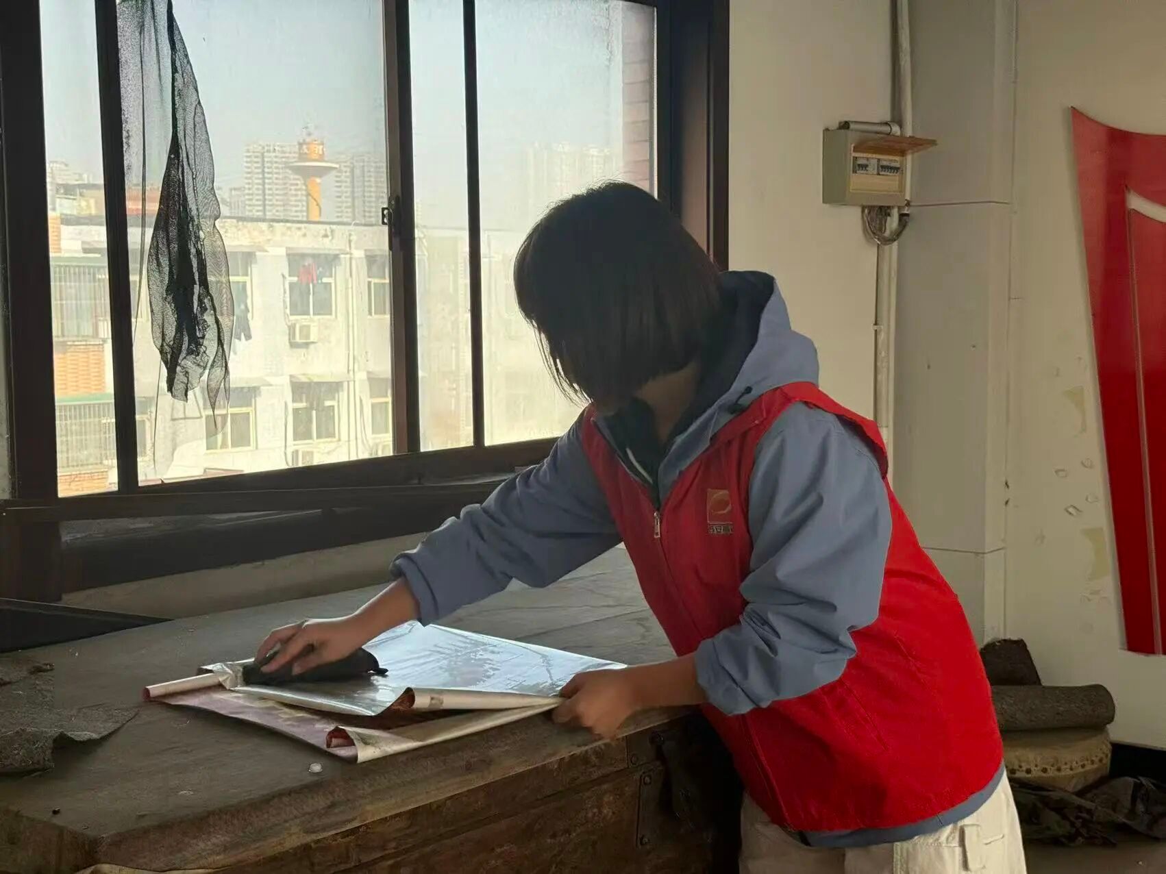 一组队员协助社区工作人员整理并抄写资料。社区工作人员耐心讲解资料分类标准和归档要求,队员们认真聆听、仔细记录。有的队员负责核对原始数据,确保信息准确无误;有的队员伏案抄写,一笔一画地将重要信息誊录到新的登记册上;还有的队员协助整理装订,将散落的文件有序归档。大家各司其职,配合默契,在与社区工作人员的配合下,原本繁杂的资料很快变得井井有条。
