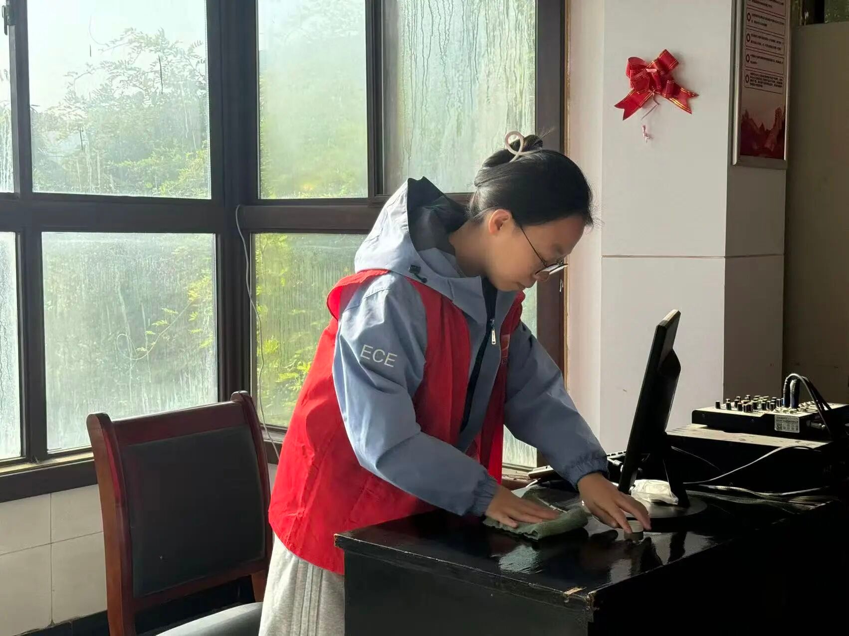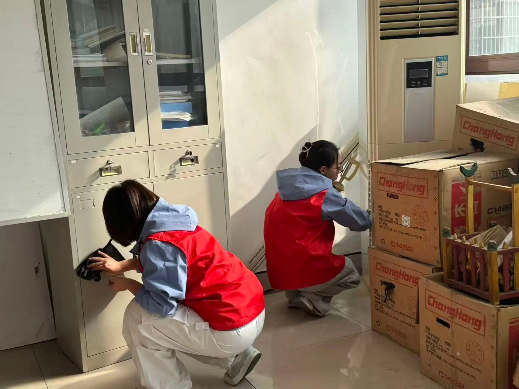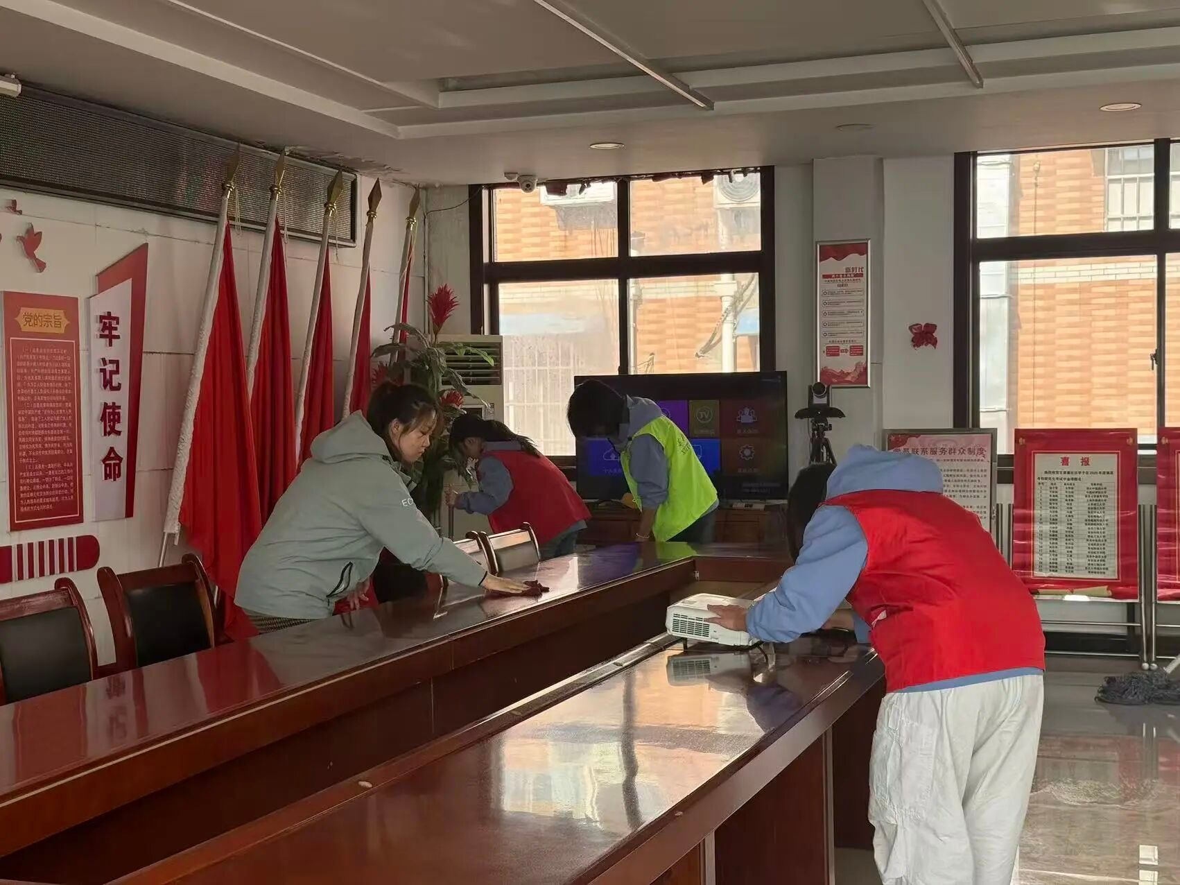 另一组队员则与社区工作人员一同打扫社区会议室——大家分工协作,有的扫地、有的拖地、有的擦拭桌椅,彼此配合默契,现场氛围融洽温馨。一次次俯身擦拭,一遍遍耐心整理,一句句温暖交流,志愿者们不仅用双手美化社区环境,也在协作中拉近了与社区工作人员的距离,让初冬的社区洋溢着一片和谐与暖意。